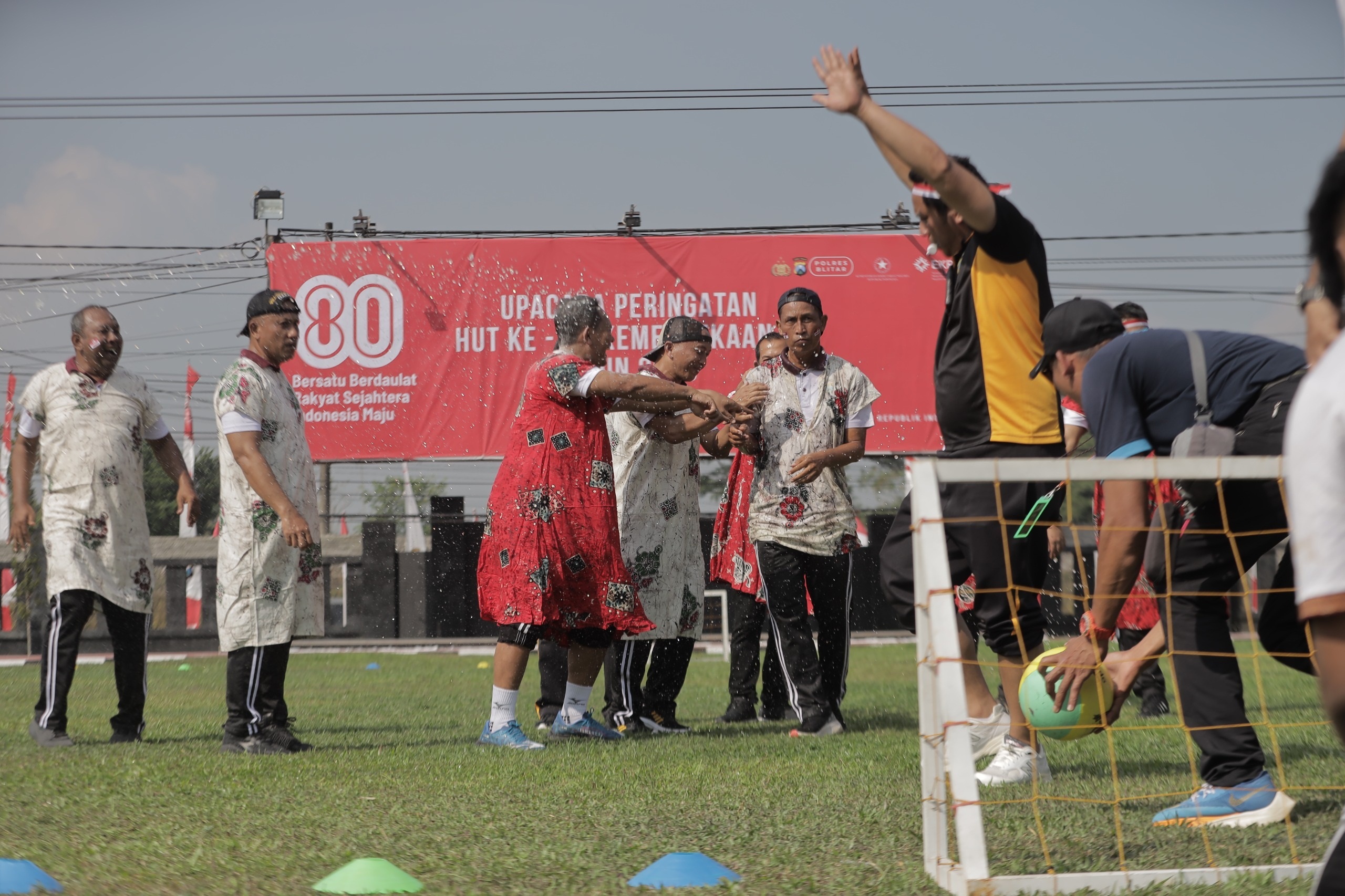 Usai jalan sehat, berbagai lomba digelar. Salah satu yang paling menyita perhatian adalah lomba sepakbola mini. Bukan hanya ukuran lapangan yang lebih kecil, melainkan juga kostum para pemain. Polisi yang biasanya tampil gagah dengan seragam dinas, kali ini justru mengenakan daster layaknya emak-emak. Tingkah kocak mereka saat mengejar bola sukses mengundang gelak tawa rekan-rekan dan penonton.