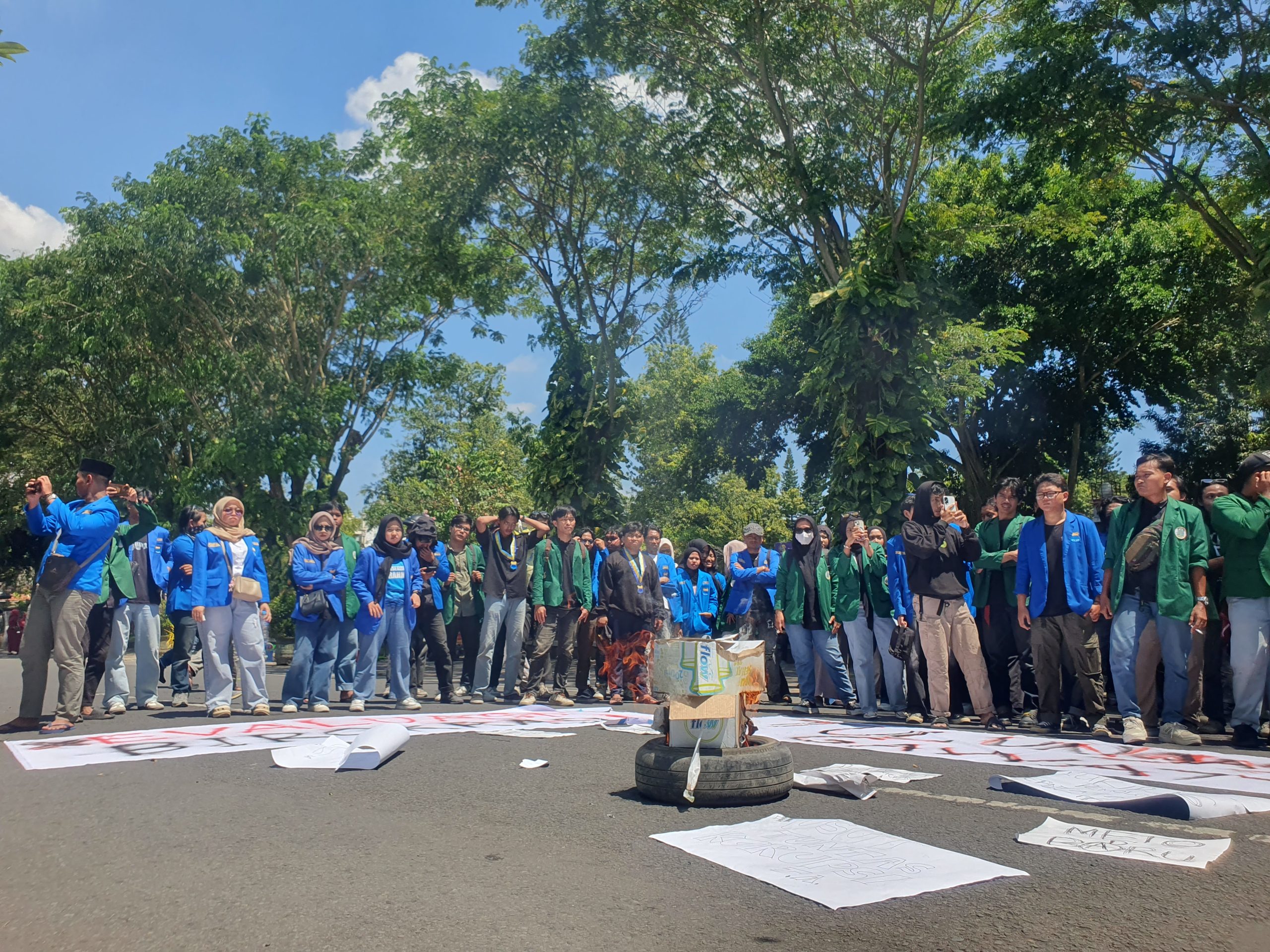 Sebagai bentuk kekecewaan, massa aksi juga membakar ban bekas di depan gedung DPRD. Aksi kemudian dilanjutkan dengan dialog bersama empat anggota DPRD Tulungagung.