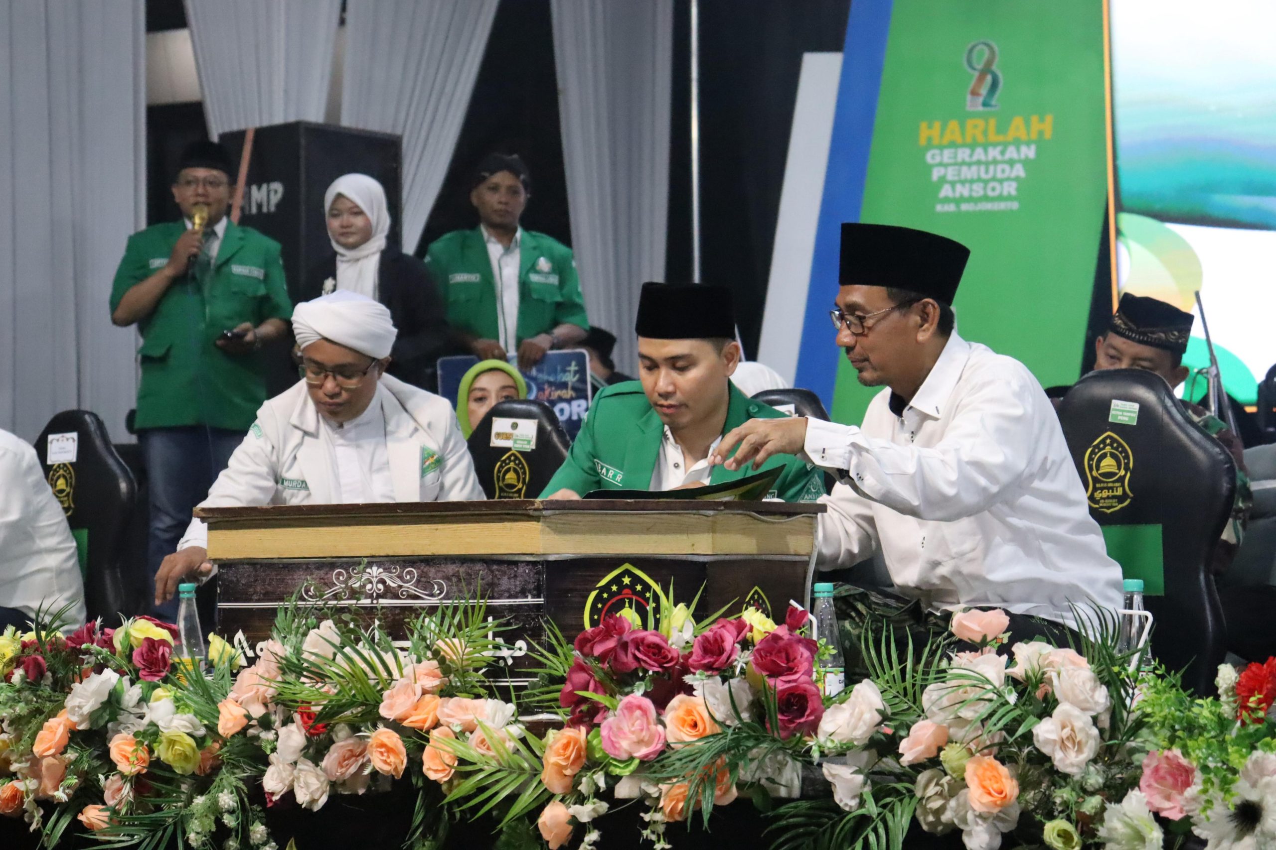 Mojokerto, SEJAHTERA.CO – Bupati Mojokerto Muhammad Albarraa menghadiri malam puncak peringatan Hari Lahir (Harlah) ke-92 Gerakan Pemuda Ansor Kabupaten Mojokerto, Minggu (26/4/2026) malam.